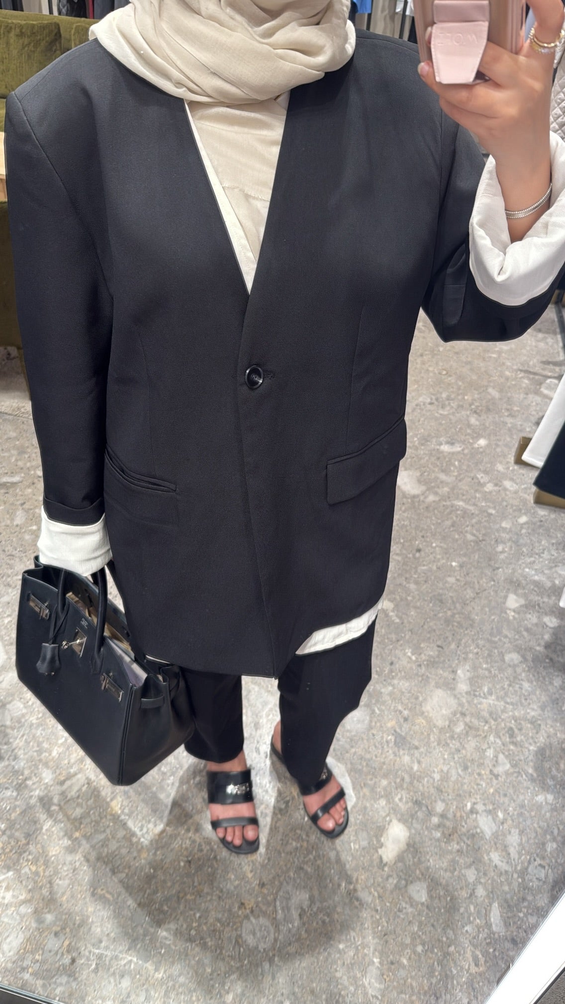 a sleek black blazer with a white layer attached underneath